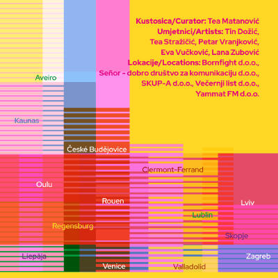 Young artists (Tin Dožić, Tea Stražičić, Petar Vranjković, Eva Vučković, Lana Zubović), selected by curator Tea Matanović, will “take over” spaces within renowned companies operating in or connected to the cultural and creative industries: Bornfight, Señor – communication company, SKUP-A d.o.o., Večernji list d.o.o., and Yammat FM d.o.o.