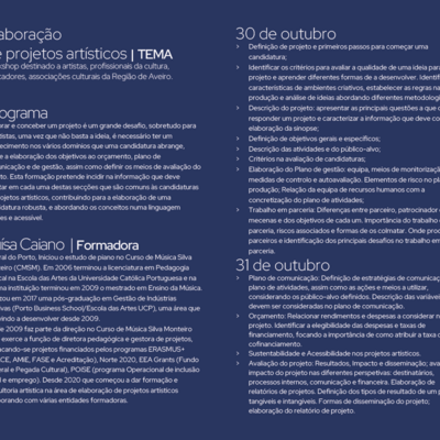 Since that same year [2009], she has been part of the management team at the Silva Monteiro Music Course, where she works as pedagogical director and project manager, highlighting projects financed by the ERASMUS+ programs (SPACE, AMiE, FASE and Accreditation), Norte 2020, EEA Grants (Bilateral Fund and Cultural Footprint), POiSE (Operational program for social inclusion and employment). Since 2020, she began providing training and artistic consultancy in the area of developing artistic projects, collaborating with various training entities.