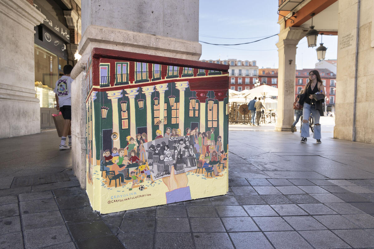 Plaza del Corrillo: Cuadro eléctrico "Valladolid en blanco, negro y colores" por Crayolina Ilustración (Ephemera Phestival 2025)