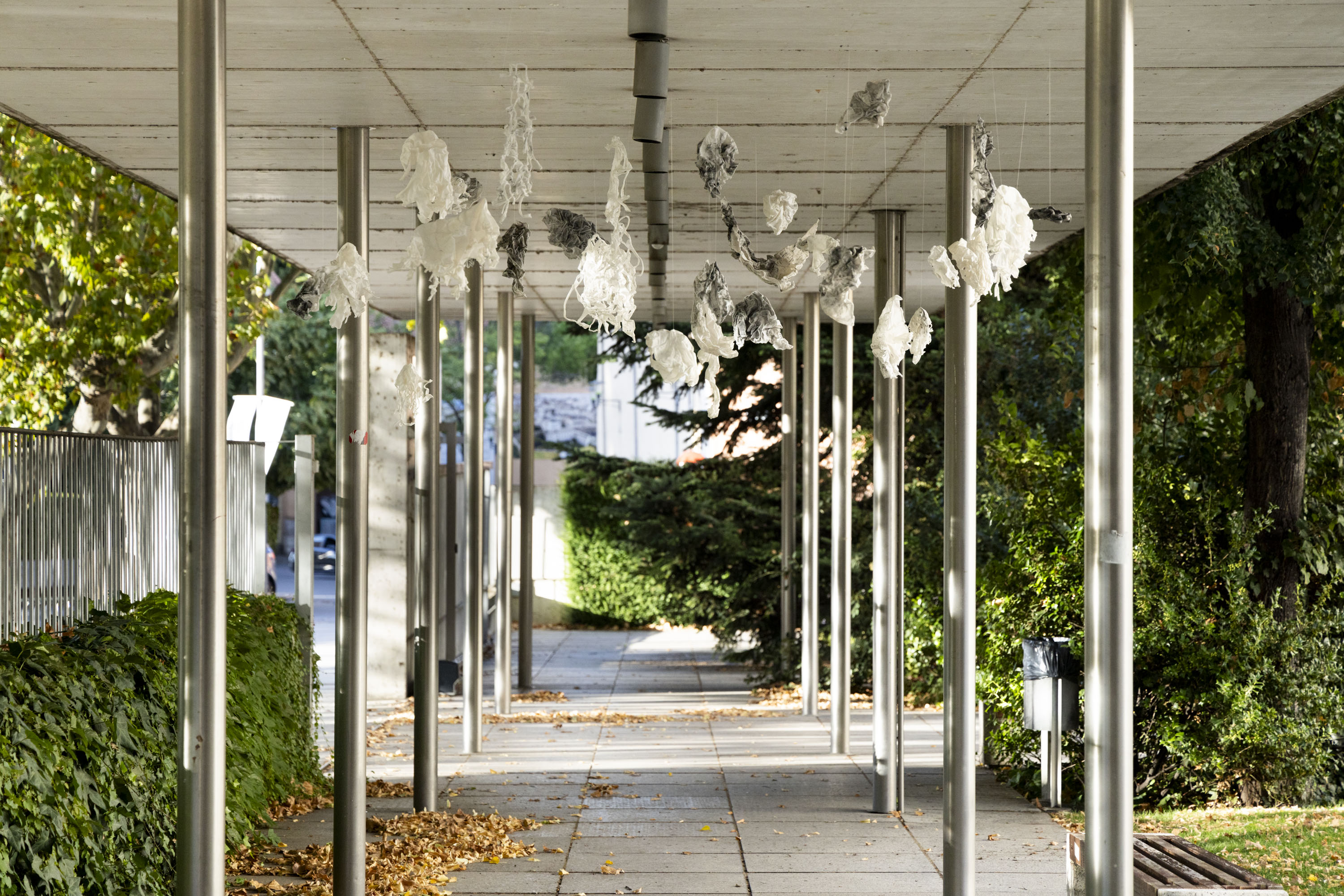 La conexión emocional entre el ser humano y la naturaleza es importante para mí, por lo que aspiro a traer esa parte de la naturaleza a la ciudad, a los espacios arquitectónicos. Usando expresiones gráficas, tomando una impresión de carbón del suelo del bosque, una corteza de árbol o una piedra en textiles, creo una imagen más auténtica de la naturaleza para objetos escultóricos. Para dar forma a las esculturas, uso cera caliente sobre textiles para formar el objeto con mis manos. La cera crea translucidez, fragilidad y una nueva materialidad al textil. La imagen resultante permite ver y experimentar un toque visual a la naturaleza, a su superficie.